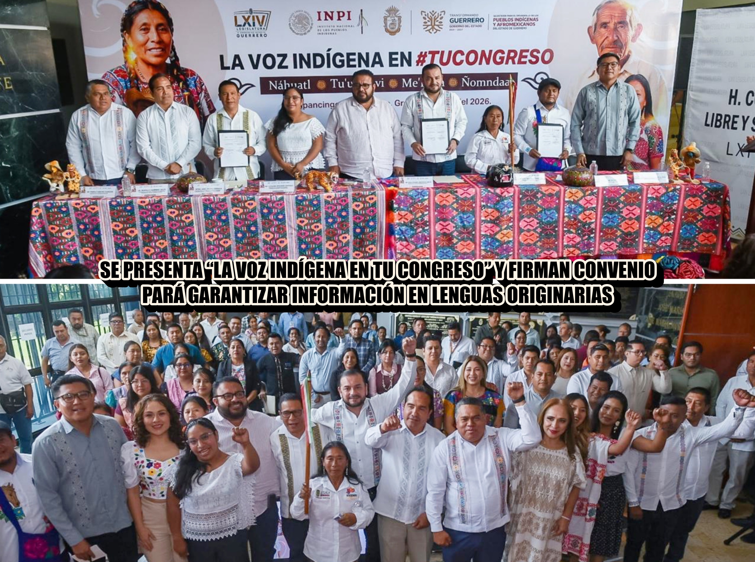 Chilpancingo, Gro., 16 de abril de 2026.— El Congreso del Estado realizó este jueves la presentación del proyecto “La Voz Indígena en tu Congreso”, así como la firma de un convenio de colaboración entre el Poder Legislativo, el Instituto Nacional de los Pueblos Indígenas en Guerrero y la Secretaría para el Desarrollo de los Pueblos Indígenas y Afromexicanos. El objetivo es garantizar el acceso a la información sobre las actividades legislativas mediante su traducción a las lenguas originarias náhuatl, tu’un savi, me’phaa y ñoomnda.