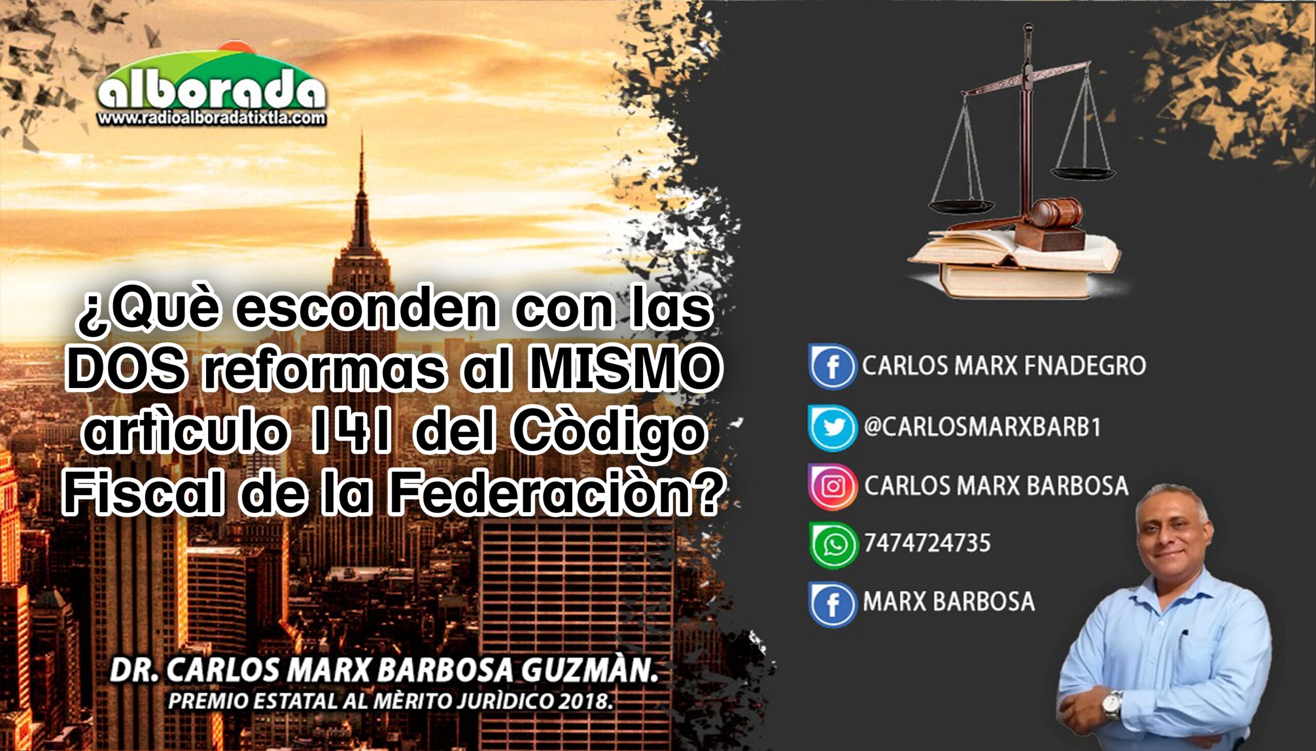 * CARLOS MARX BARBOSA GUZMÁN, es Licenciado en Derecho. Cuenta con una especialidad en Comunicación, Es Maestro en Derecho Procesal Laboral, Egresado con Mención Honorífica, Es Maestro en Derechos Humanos y libertad religiosa. Es Maestro en Derecho Fiscal. Es Doctor Honoris Causa, por la Universidad de España y México; Es Doctor en Anticorrupción y Sistema de Justicia. Es Agente Capacitador aprobado por la Secretaría del Trabajo y Previsión Social Federal. Fue galardonado con el Premio Estatal al Mérito Jurídico 2018. También fue galardonado con la medalla nacional “Legión de Honor 2019”. De igual forma, en el año 2020, recibió el Galardón por 25 años de trayectoria como articulista. En abril del 2022 recibiò el premio “Micròfono de Oro” por difundir la cultura jurìdica en Mèxico. En 2023 recibiò la presea “Justicia Social” por parte de la FEMECA. En 2025 tambièn recibiò la presea “Justicia Social” por parte de la FENALT. Es autor de 9 libros de derecho y en enero de los años 2023, 2024 y 2025, fue reconocido por la revista “Defensa Fiscal”, como uno de los fiscalistas màs importantes de Mèxico.