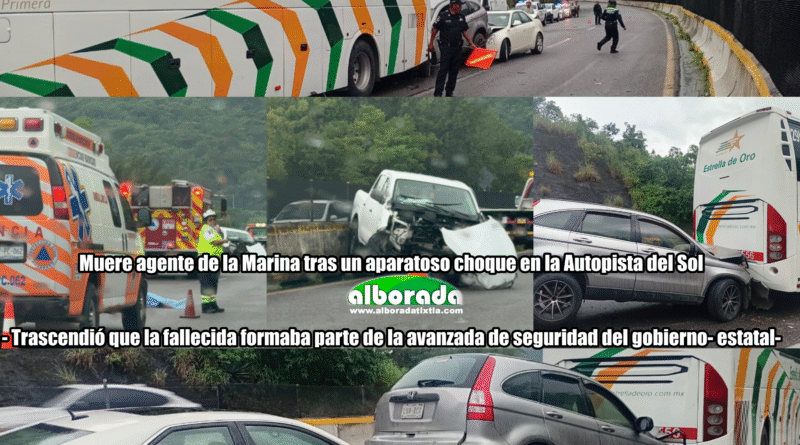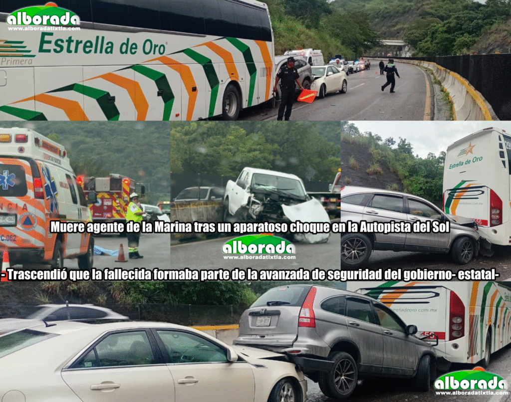 Chilpancingo, Gro., 01 de octubre de 2025.- La tarde de este miércoles, una agente en activo de la Secretaría de Marina-Armada de México, de la que trascendió integraba la avanzada de seguridad del gobierno estatal, perdió la vida tras sufrir un aparatoso accidente sobre la Autopista del Sol, a la altura del kilómetro 295, en la comunidad de Acahuizotla, municipio de Chilpancingo.