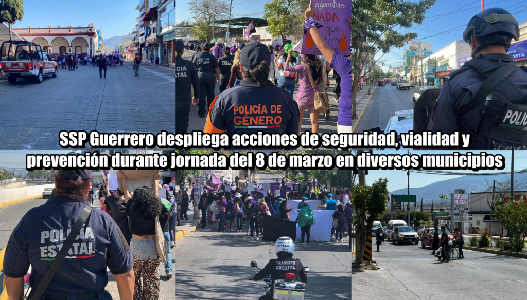- SSP Guerrero despliega acciones de seguridad, vialidad y prevención durante jornada del 8 de marzo en diversos municipiosChilpancingo, Gro., 8 de marzo de 2026. En el marco de las actividades conmemorativas por el Día Internacional de la Mujer, la Secretaría de Seguridad Pública del Estado de Guerrero implementó un dispositivo integral de seguridad, vialidad y proximidad social en diversos municipios de la entidad. Elementos de la Policía Estatal y Tránsito Estatal realizaron