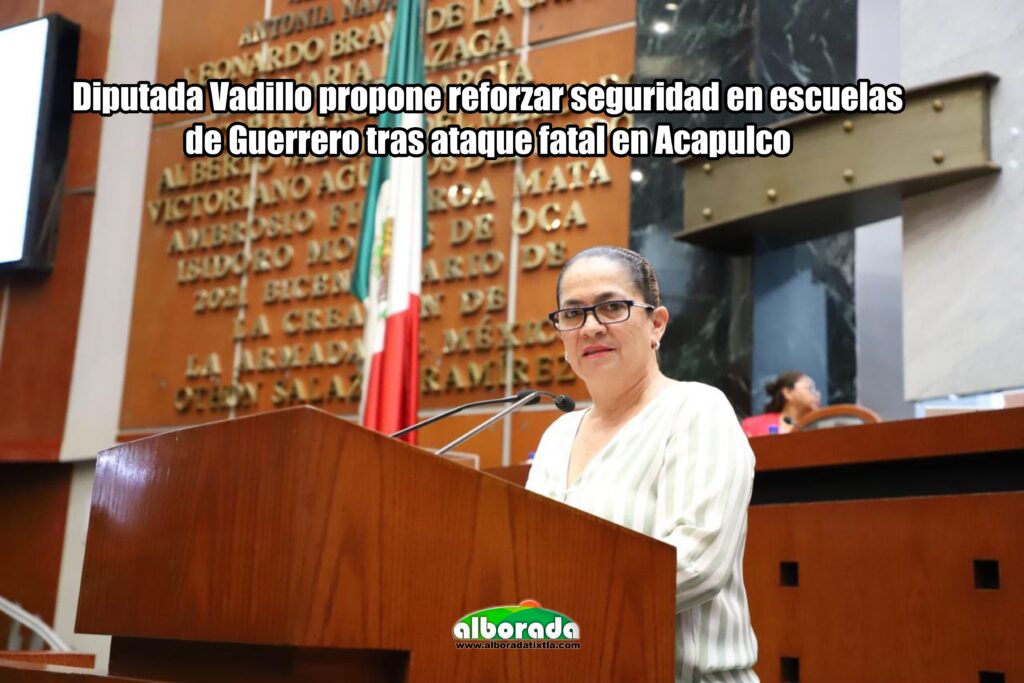 - Diputada Vadillo propone reforzar seguridad en escuelas de Guerrero tras ataque fatal en Acapulco✍️ Jesús Hernández La diputada local Ma. del Pilar Vadillo Ruiz presentó un Acuerdo Parlamentario para exhortar a la Secretaría de Seguridad Pública federal y otras instancias a intensificar la vigilancia en planteles educativos de Guerrero, especialmente en horarios de entrada y salida de estudiantes. La iniciativa, que se analiza en las Comisiones Unidas de