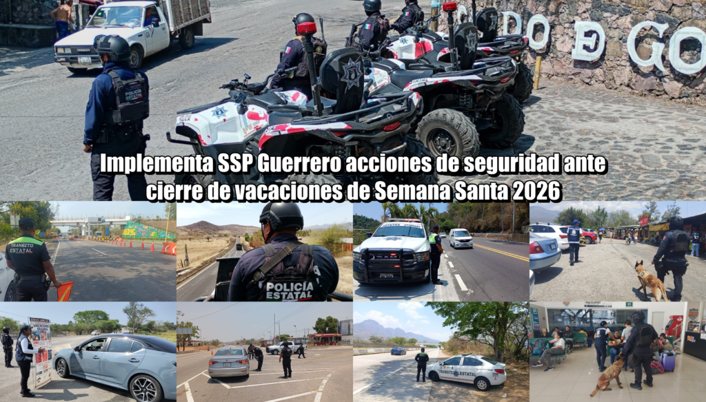 - Implementa SSP Guerrero acciones de seguridad ante cierre de vacaciones de Semana Santa 2026Ante el regreso de cientos de vacacionistas a sus lugares de origen, la Secretaría de Seguridad Pública del Estado de Guerrero implementa un operativo especial de seguridad en todo el estado, con el objetivo de garantizar traslados seguros y mantener el orden en carreteras y destinos turísticos. Como parte de estas acciones, elementos de Tránsito
