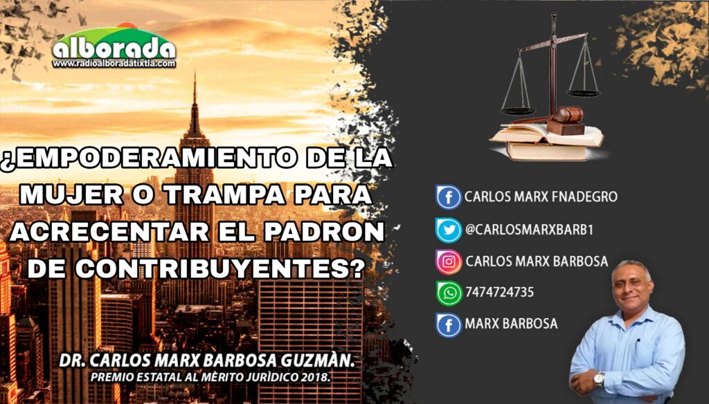 - ¿EMPODERAMIENTO DE LA MUJER O TRAMPA PARA ACRECENTAR EL PADRON DE CONTRIBUYENTES?Autor: Dr. Carlos Marx Barbosa Guzmàn.Premio Estatal al Mèrito Jurìdico 2018.Correo: inaicalp18@outlook.es Introducción. Desde 1975 la Organización de las Naciones Unidas conmemora el 8 de marzo como el Día Internacional de la Mujer, en esta ocasión con el lema: “Para las mujeres y niñas en toda su diversidad: derechos, igualdad y empoderamiento”. Y derivado de