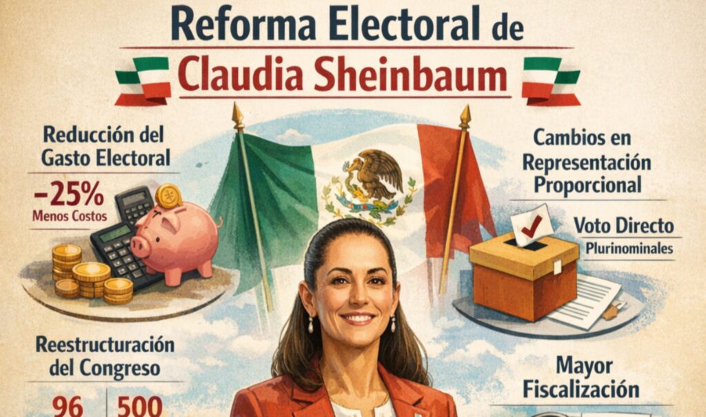 - “Qué es la reforma electoral presentada por Claudia Sheinbaum”La reforma electoral propuesta por la presidenta Claudia Sheinbaum es una iniciativa de cambio constitucional y legal al sistema electoral de México, que fue enviada al Congreso de la Unión para su discusión y eventual aprobación en el primer semestre de 2026.El País 👉 Objetivo general:Reducir los costos de las elecciones, reorganizar la forma en